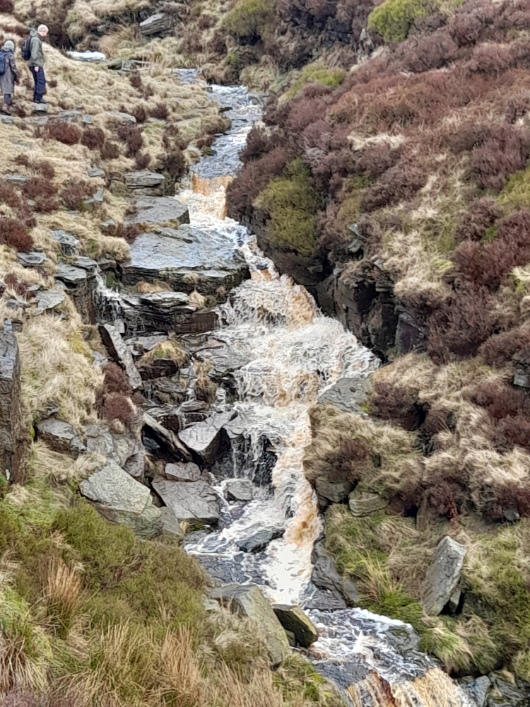 From the cafe (cups of tea) we set off to Arnfield, then up the old track by Arnfield Brook. (Why had it been paved with hardcore up to the steep incline but no further?) On the plateau above is a small reservoir pond from which emerges a line of old pipe on concrete stilts, made of cement and possibly asbestos,, to carry water down towards Tintwistle. Rubber sealing rings are still in good condition despite the exposure!