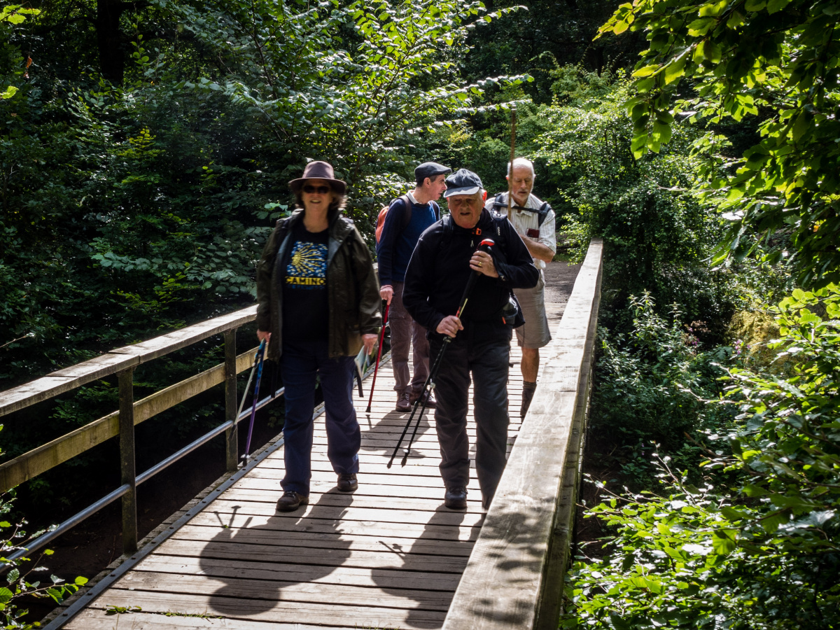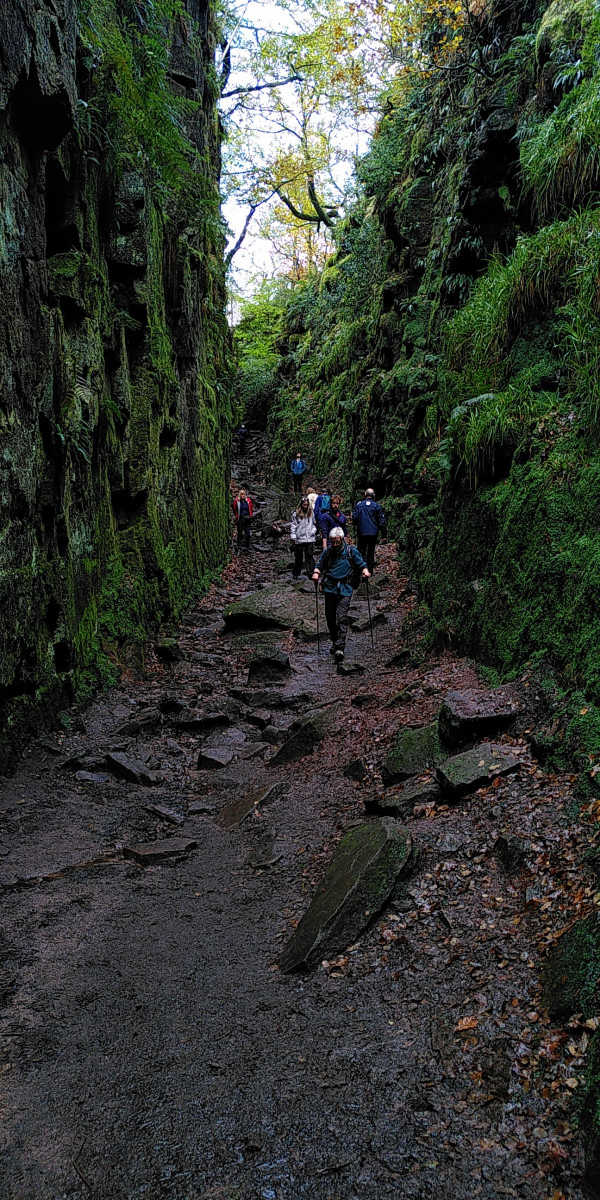 The Roaches walk was a regular date on the calendar some years ago but has not occurred since the Pandemic. Ron led a shortened version today, with six walkers in the beautiful autumn-tinged Roaches landscape. Today's main complaint? Mud! - not surprising given the wet months we have had. And the Gradbach car park, which gets full before 10 o'clock, our start time; the Roaches Estate has become very popular! The walk itself was astounding. As we arrived, mist shrouded the hills, but as we set off it suddenly disappeared, revealing patches of blue sky, then sun, with perfect walking temperature. We followed the swollen River Dane to Danebridge where, upon seeing the signpost there, one member remarked, "the longest two-and-a-quarter miles in Britain; it is at least three-and-a-half!" The trees along the river were full of colour and light, lit by the autumn sun. From Danebridge, it was uphill to Hanging Stone Rock at the start of the Roaches Ridge, for lunch. There seemed to be a lot of young people walking, the reason for which we discovered on the way up when we met a marshal for the Duke of Edinburgh's expeditions. After lunch, along the Ridge, then we split into two parties, one that wanted to shorten their route by going direct to Lud's Church, the other further along the ridge before descending to Lud's Church. Lud's Church is a cleft in the hillside where the persecuted Lollards used to meet in secret for worship, now with Liverworts and Mosses festooning the dripping rock sides. One of the parties missed it and got "lost in the forest" for a time before managing to find a sign back to Gradbach.